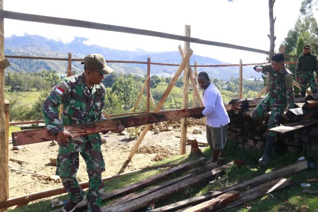 BERTUGAS DI PEDALAMAN PAPUA SATGAS YONIF MR 412 KOSTRAD BANTU PEMBANGUNAN RUMAH MILIK PENDETA