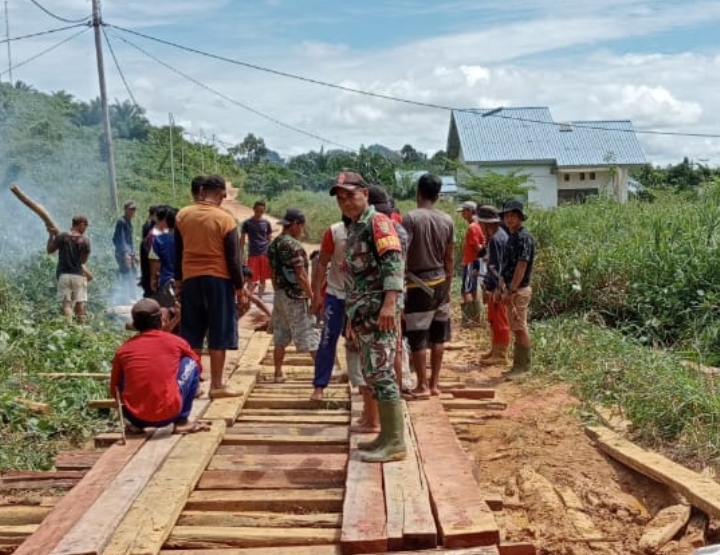 Dikatakannya Pak Tikin selaku kepala dusun “dalam bulan ini sering turun hujan mengakibatkan jalan poros desa ini tergenang air sehingga terbentuk lumpur yang dalam,maka kami secara bergotong royong di bantu oleh bapak Satgas membuat bantaran kayu yang di paku seperti jembatan,supaya kendaraan bermotor maupun mobil bisa melintas,serta mengucapkan terima kasih banyak atas bantuan dari bapak-bapak Satgas yang telah membantu kami secara bergotong royong dalam benahi jalan desa ini”, pungkasnya.