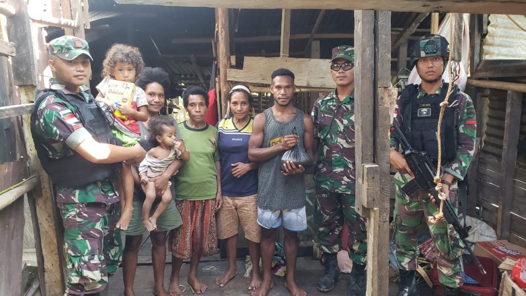 Personel Satgas Pamtas Yonif 126/KC Pos Batom, kembali melakukan aksi Bakti sosial dengan memberikan bantuan sembako kepada warga Kampung Batom II, Distrik Batom, Kabupaten Pegunungan Bintang.