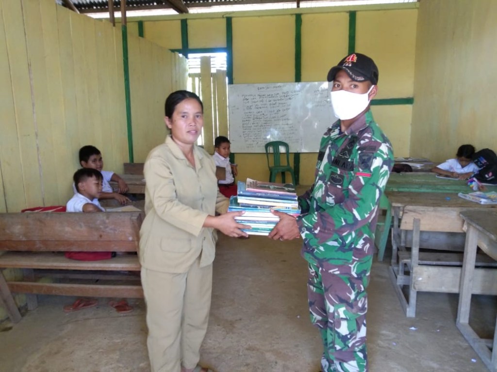 Anggota Satgas Yonif 144/JY Berikan Bantuan Buku Tulis Ke SD Mini Perbatasan