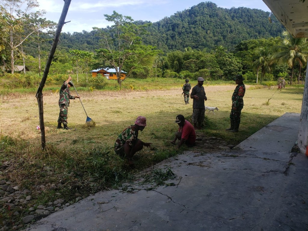 Keerom – Sebagai wujud kepedulian terhadap kebersihan lingkungan, Satgas Pamtas RI-PNG Yonif 126/KC Pos Batom mengajak warga melakukan pembersihan lingkungan Kampung Batom, Distrik Batom, Kabupaten Pegunungan Bintang.