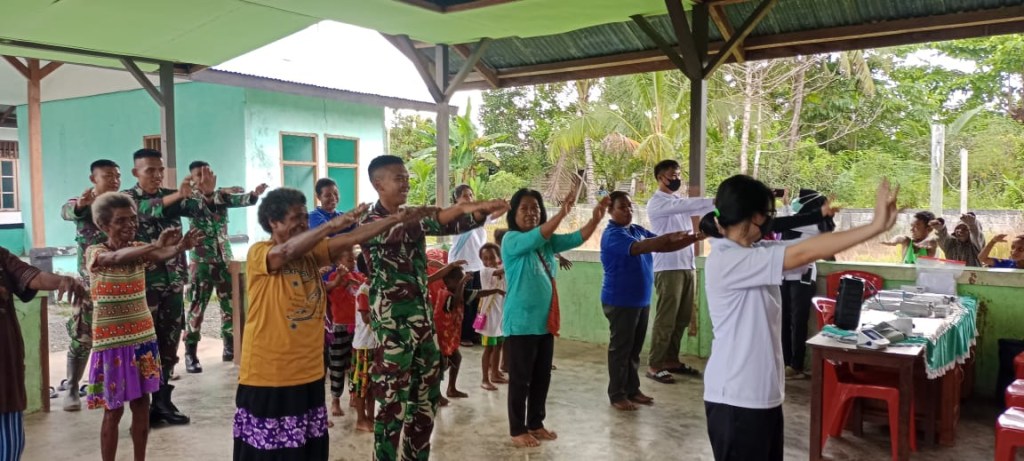 Papua, Demi menjaga kesehatan agar selalu bugar dalam melaksanakan aktifitas sehari-hari, Satgas Yonif 126/KC Pos Kotis bekerja sama dengan Puskesmas Senggih mengajak warga untuk melaksanakan senam bersama sekaligus menggelar pengobatan dan pengecekan kesehatan gratis di Kampung Senggih, Kabupaten Keerom.