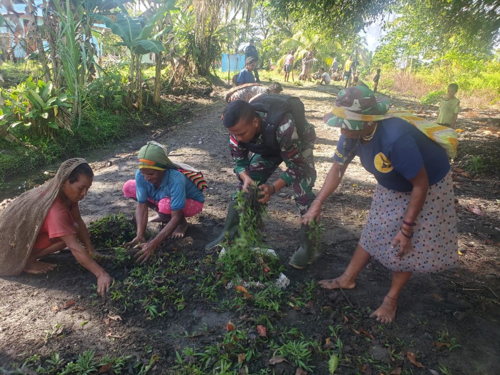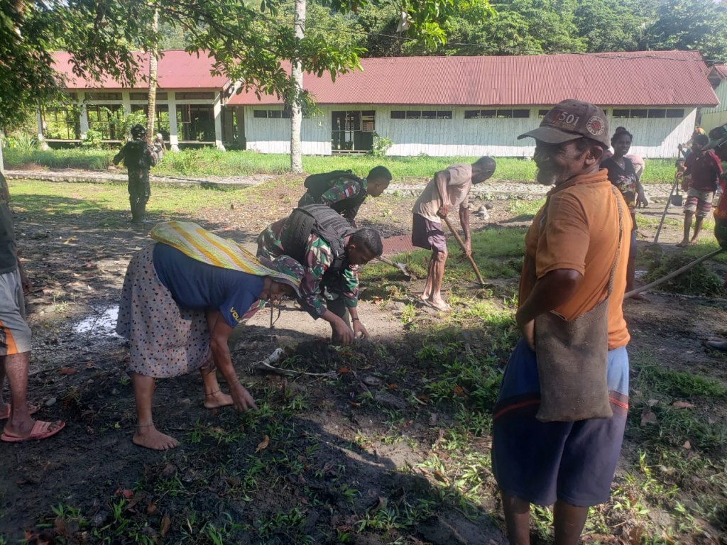 KEMANUNGGALAN SATGAS YONIF 126/KC LAKSANAKAN KARYA BAKTI BERSAMA WARGA PERBATASAN PAPUA