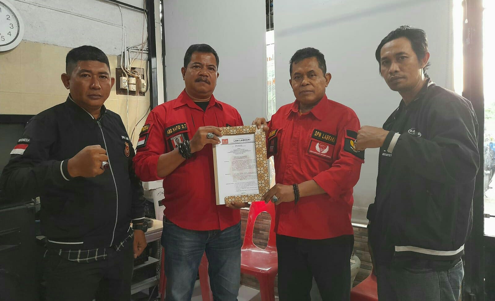 Penyerahan Surat Keputusan (SK) diterima langsung ketua DPW wilayah Sulsel H.A.Arif Jamaro dan Di serahkan langsung oleh ketua Umum DPN LSM LABRAKI Abd Hafid Daeng Tiro ,Di saksikan Amsar DN sebagai Pengurus DPN Dan Muh habibi DM Sebagai Wakil Ketua DPW Wilayah Sulsel.