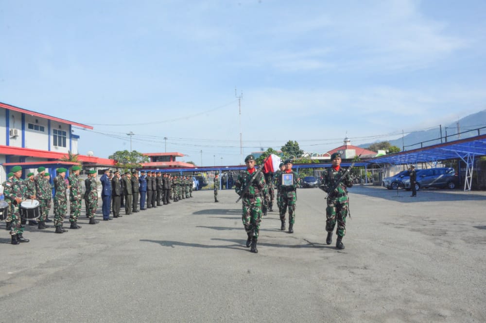 JAKARTA – Komandan Korem 172/PWY Brigjen TNI J.O Sembiring memimpin upacara pengantaran jenazah anggota Satgas Yonif PR 431/SSP Pratu Anumerta Beryl Kholif Al Rohman yang akan diberangkatkan ke kampung halamannya.