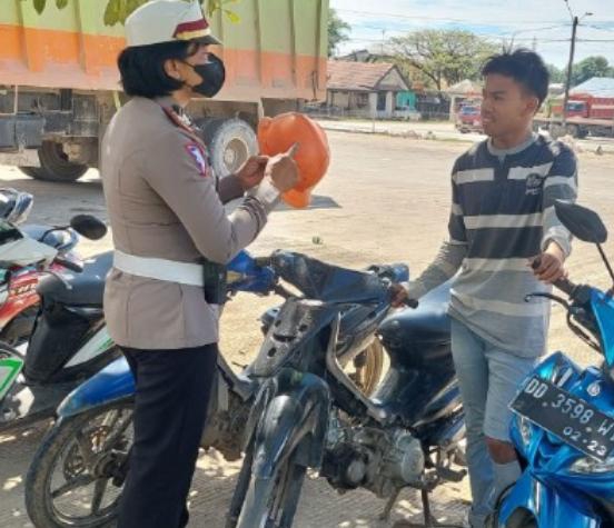 PANGKEP – Kasat Lantas Polres Pangkep AKP Ida Ayu Made Ari Suastini,SH memberhentikan pengendara sepeda motor yang tidak lengkap secara kasat mata saat berkendara di jalan raya, Kamis (11/08/22).