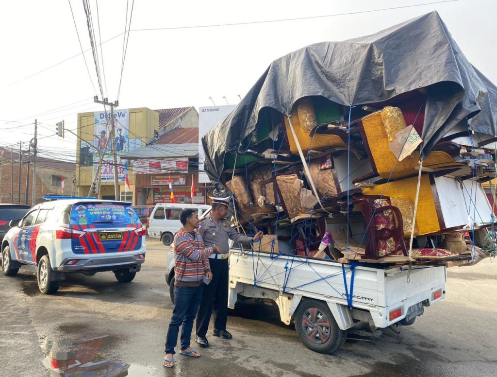 Salahsatu penindakan tilang yang dilakukan pada kendaraan angkutan (pick up), nomor Polisi DD 8776 RI, yang memuat meubel (kursi), tampak Kasatlantas sebelum melakukan proses tilang, melakukan edukasi pasar pengemudi tentang aturan serta bahaya yang akan ditimbulkan akibat memuat barang secara berlebihan.