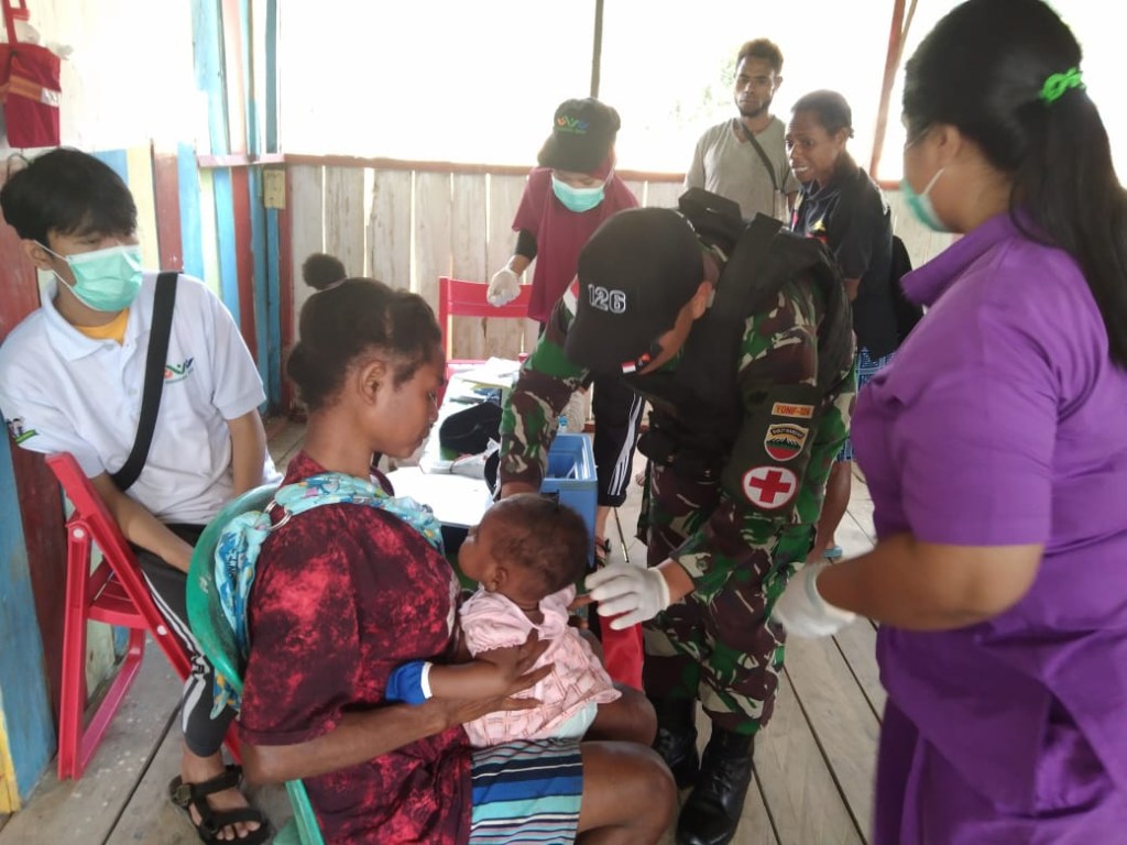 Papua, -Dalam rangka menjaga kesehatan dan mencegah dini penyakit dikalangan masyarakat, Satgas Yonif 126/KC Pos Tatakra bekerja sama dengan nakes Puskesmas Ubrub melaksanakan bakti sosial berupa pengobatan massal kepada masyarakat Kampung Tatakra, Distrik Web, Kab. Keerom.