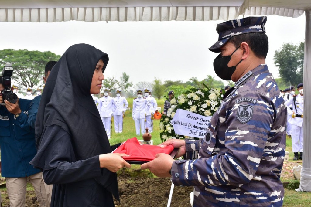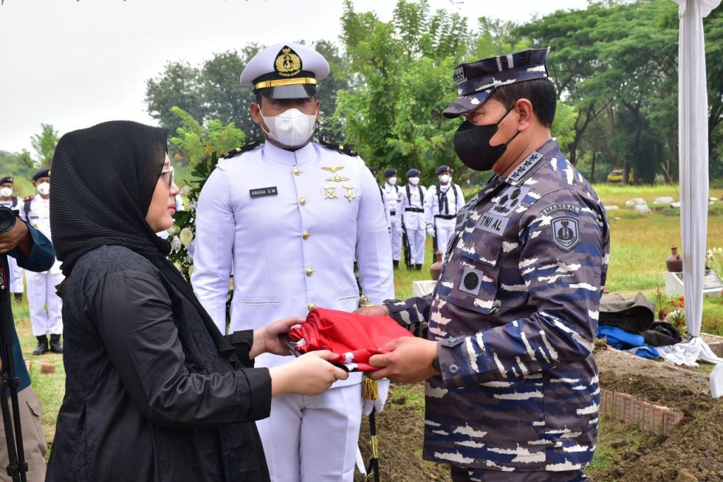Pada kesempatan tersebut, sebagai tanda penghormatan Kasal meletakkan karangan bunga di pusara kedua pilot terbaik TNI AL itu dan menyerahkan bendera merah putih kepada pihak keluarga sembari menyampaikan rasa belasungkawanya.