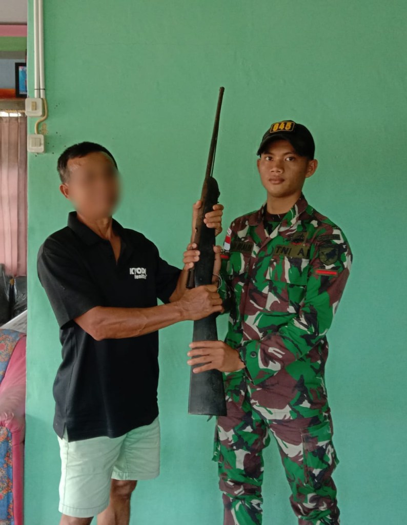 Bapak SH Sambil berbincang-bincang bersama Personil Pos Simpang 3 Lokpon yang melaksanakan Anjangsana, Bpk SH menawarkan 1 (satu) pucuk senjata rakitan jenis lantak ini kepada anggota Pos Satgas yang dia punya karena sudah lama tidak dipakai lagi berburu dihutan, bapak SH memberikan Senjata api rakitan ini mengungkapkan sebagai bentuk rasa simpati dan terimakasih kepada Pos Simpang 3 Lokpon karena sudah Membina atau melatih fisik Anaknya (Jinggo 19 Thn) untuk persiapan daftar Menjadi Anggota TNI-AD. pungkasnya