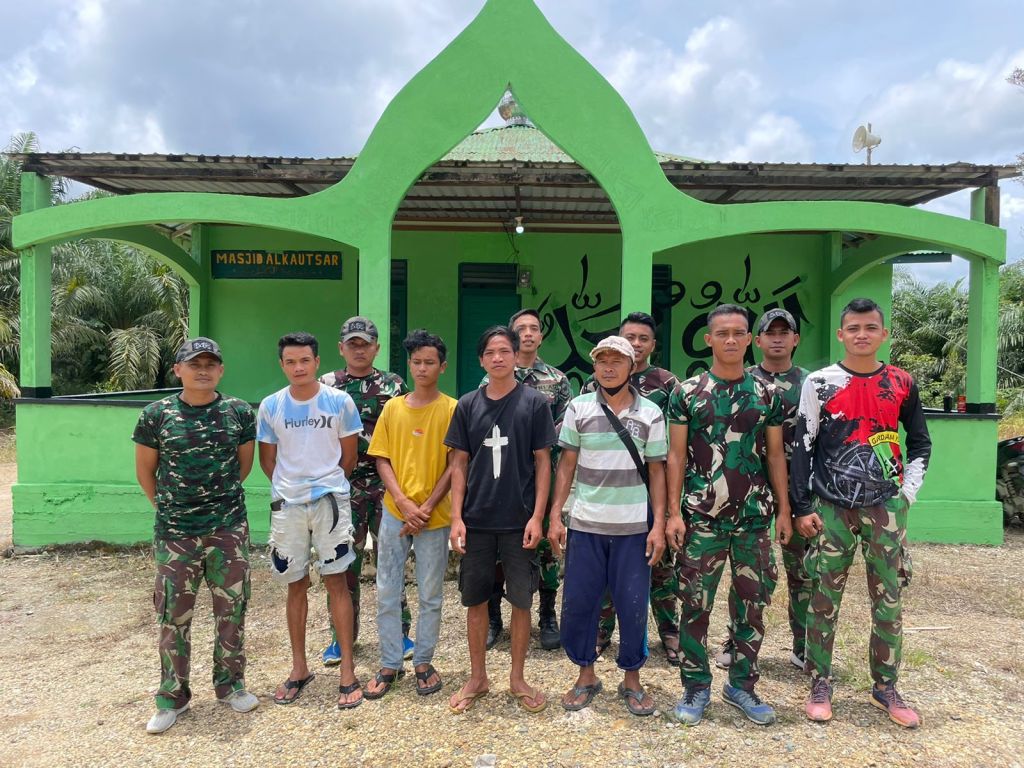 [Sanggau, Kalbar] − Bahu membahu Bersama warga masyarakat perbatasan, Personil Pos Koki Sei Daun SSK 3 Satgas Pamtas RI-MLY Yonif 645/Gty sejumlah 6 (enam) orang personil melaksanakan kegiatan Karya Bhakti Pengecatan dan Perbaikan Masjid Al Kautsar, Dusun Sei Daun, Desa Malenggang, Kec Sekayam Kab. Sanggau, Provinsi Kalimantan Barat.