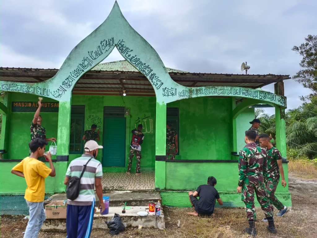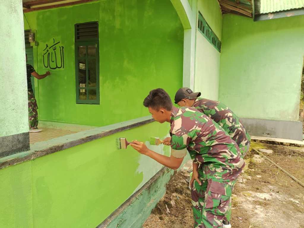Prajurit Satgas Pamtas Yonif 645/Gty Karya Bhakti Pengecatan Masjid Al Kautsar Bersama Warga Perbatasan